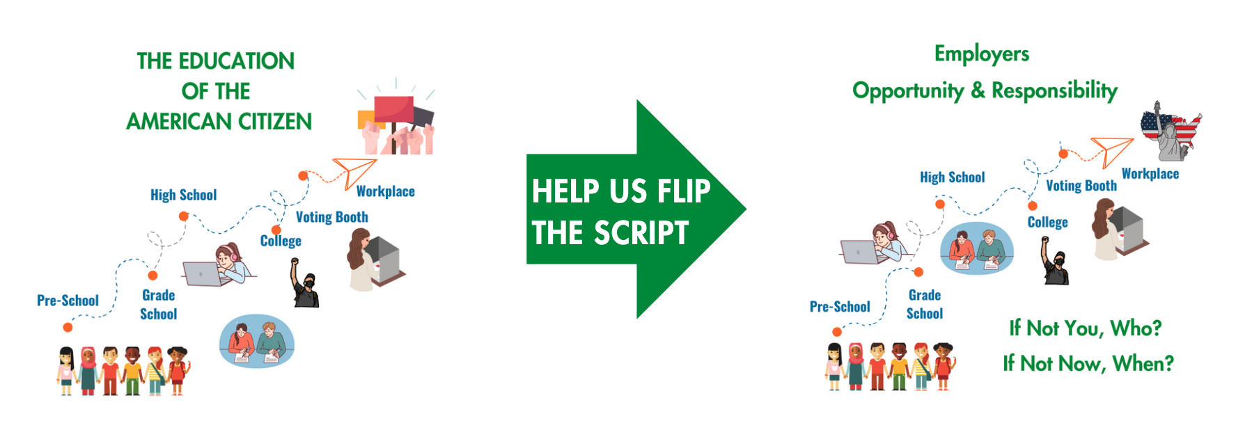 The Solution: EMPLOYERS! There are millions of people in the workforce who still need to learn basic civics and economic policies of freedom. They may already be in leadership positions, yet remain unaware of the principles that made this nation great. If we are to save America for future generations, and if we truly care for each individual, we must share foundational policies of freedom and prosperity with them.